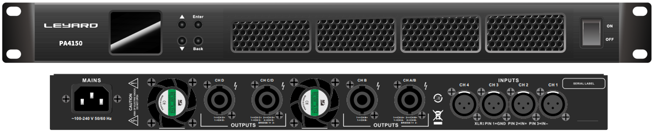 PA4150是高性能4通道D类音频功率放大器,PA4150峰值总功率达到1200W(负载为8Ω时),适用于驱动leyard商用系列扬声器。