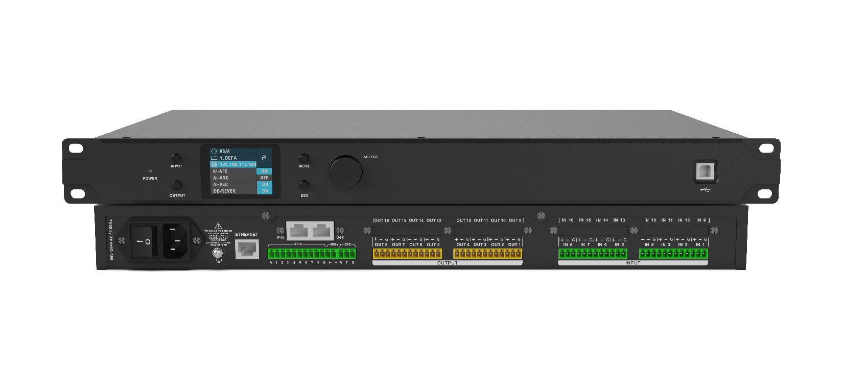 AM0808音频处理器配置有8*8的模拟输入输出接口。内置FIR滤波器、相位滤波器、AFC、AEC、ANC、AGC、AMX、噪声门、压缩器、限幅器、PEQ、延时器、高低通分频滤波器,可满足多种场景使用需求。
