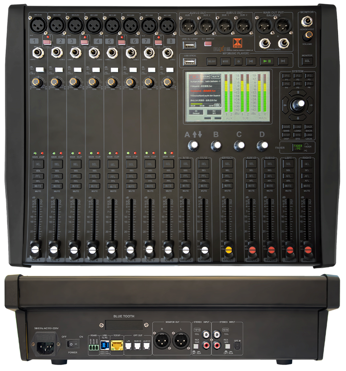 DMX1206是一台12路输入6路输出的数字调音台。内置参量均衡算法,满足现场调音需求;内置USB录音及音频播放器,满足音乐录播需求;内置高清显示屏及场景预设功能,具有便捷的较好界面与使用体验。